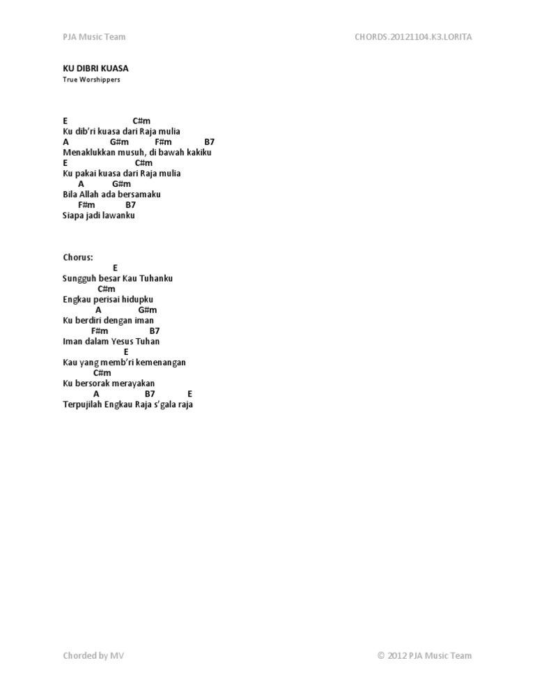 Lagu Rohani Ku Dibri Kuasa Artist True Worshippers Select Key Tempo 145 Intro D G D D G D 2x D G Bm C 2x D Bm Ku Dib Ri Kuasa Dari Raja Mulia